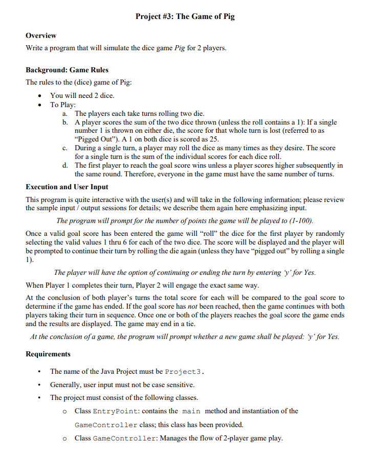 The game of Pig is a multiplayer game played with a single six-sided die. The pig dice game built in Java and playable through the command line interface - GitHub - jombasticpig-dice-java. Im writing a program in Java a game called Pig.